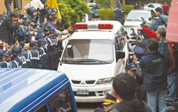遭羁押因禁食而戒护送医的陈水扁经3天疗养后,19日下午1点从板桥医院还押台北看守所,车道两旁的媒体隔着大批维安警察抢拍救护车内的阿扁。(王锦河摄)
