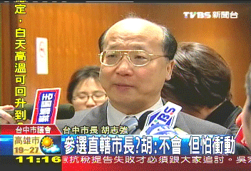 中新网11月21日电 据台湾TVBS报道,2010年台中县市将合并“升格”为“直辖市”,到底台中市长胡志强会不会参选“直辖市长”?胡志强表示,他理性、平和、冷静的跟大家说,他不会参选,但就怕大家逼他,让他太冲动,此话一出,又让大家留有想象空间。