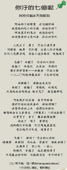 看来网友的填词和写诗功力,更胜阿扁一筹;最近即有网友、将周杰伦“魔杰座”专辑的歌曲“说好的幸福呢”,改编成“你污的七亿呢”,透露对洗钱案的无奈。
