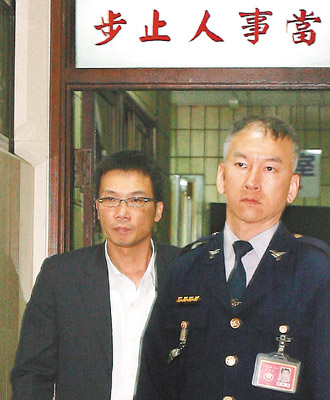 因扁家弊案而遭收押马永成(左),以五十万元交保并限制住居、出境,在法警陪同下,离开台北地方法院。图片来源:台湾《联合报》