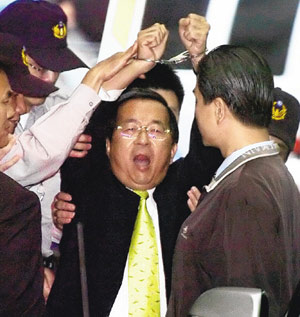 陈水扁被收押高举手铐的一幕。图片来源:台湾《联合晚报》