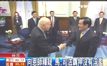 中新网12月16日电 马英九在美求学时的老师孔杰荣质疑台相关部门对陈水扁案件司法羁押的正当性;今天马英九接见这位恩师时澄清,上手铐不是针对个人,台湾司法羁押也没有浮滥的情况。