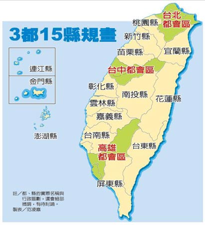 据称,“三都十五县”的三都是:台北都会区(台北市、县、基隆市,民国一○三年合并)、台中都会区(台中市、县,九十九年合并)、高雄都会区(高雄市、县,南部县市长争取一百年合并)。十五县是:桃园、新竹(新竹市、县)、苗栗、彰化、南投、云林、嘉义(嘉义市、县)、台南(台南市、县)、屏东、宜兰、花莲、台东、澎湖、金门、连江。