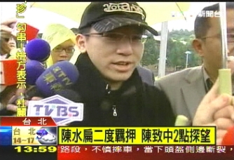 中新网12月30日电 据台湾TVBS报道,陈水扁第二度遭到羁押,由于没有禁见,他的儿子陈致中在今天下午两点到台北看守所探视。