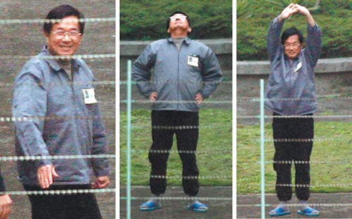 陈水扁从中央走道走进忠仁花圃时,前后共有五名管理员陪同,两个陪他运动,三个站在中央走道上观看,后来又来一个管理员陪同,总共有六名管理员伴随左右。开门前,还有管理员拿望远镜张望,并不断以无线电联系。