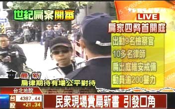 中新网1月19日电 据台湾TVBS报道,19日上午9点半,针对龙潭和南港二大弊案进行准备程序庭,6名检方激战3位律师。一开庭扁律师提出三策略,却全遭法官蔡守训当庭驳回,后来检察官当庭追加罪嫌,引发律师不满,现场爆发双方口角。