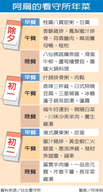 至于前东森集团总裁王令麟因为茹素,北所有准备素食收容人菜单,年夜饭也有糖醋凤梨、炒三丝及芦笋烩双菇。