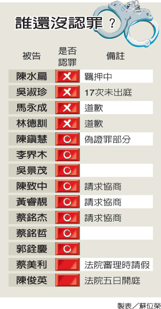 中新网2月5日电 据台湾媒体报道,台北地方法院继续开庭审理陈水扁家族四大案,今天上午陆续传讯前力麒建设董事长郭铨庆与吴淑珍的嫂嫂、被告陈俊英,两人庭上均认罪。至此,扁案被告中已有九人认罪。