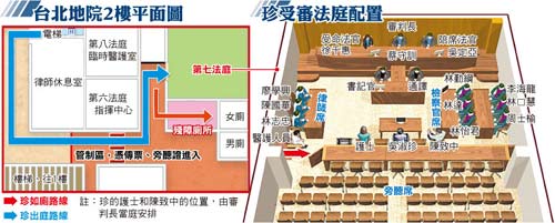 合议庭考虑吴淑珍身体状况,预计这两天各开庭4小时。法院也开放第八法庭给台大医院放置临时病床、心电观察仪器和呼吸器材,两名医师、两名护士也可在此休息,法院外也将有救护车待命。由于台大仍认为吴淑珍不适合长时间坐着,合议庭今将每30分钟让她休息一下,由医护量心跳及血压,她若有需要,可在被告席桌下摆一台电暖器保暖。