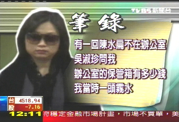 根据报道,陈镇慧向特侦组供称,吴淑珍曾经打电话问她“‘总统’办公室内的保管箱有多少钱”?马永成也供称,陈水扁亲自向企业募款动辄五六千万元,都会直接放在“总统府”内“总统的房间”,更夸张的是竟然还动用随扈帮忙押送现金。