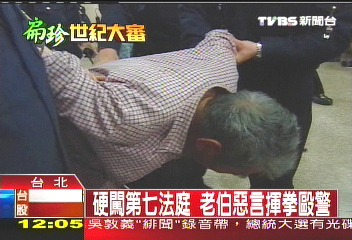 中新网2月26日电 据台湾TVBS报道,陈水扁连续3天开庭,庭外依旧闹哄哄,今天一名70多岁的老伯,在开庭后硬要闯入第七法庭,闹场举动引来法警关切,没想到老伯面对人数众多的法警,不但口出恶言,还出手打人,法警忍无可忍,最后强制执行公权力赶人。
