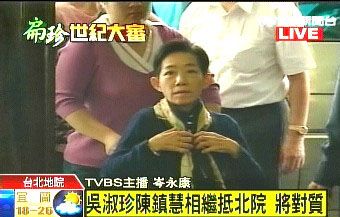 中新网3月17日电 据台湾TVBS报道,17日下午2点24分,陈水扁夫人吴淑珍穿着蓝色针织毛衣,披着丝巾,在儿子陈致中的陪同下,进入法院。陈镇慧则是戴着大墨镜,白外套、黑上衣,低调进入法院。今天首次进入实质审理,双方对质,备受注目!