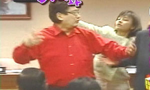 中新网4月22日电 据台湾TVBS报道,台湾“立法院”今天再度出现火爆场面,国民党“立委”李庆华讲话时突遭民进党“立委”邱议莹偷袭,被甩了一个耳光。李庆华召开记者会谴责民进党是暴力党,表示将对邱议莹提告。