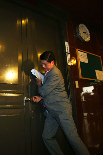 门缝中可以看到好几个民进党“立委”走来走去,国民党“立委”吴育升、卢嘉辰两人说,“尊重‘立法院’,请尊重自己好不好?里面的民进党委员光明磊落,不要跟龟儿子一样躲在那边。”