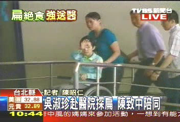 中新网5月11日电 据台湾TVBS报道,陈水扁因为绝食身体虚弱遭到强制送医,目前仍在台北县立板桥医院接受治疗。陈水扁夫人吴淑珍偕同儿子陈致中11日上午来医院特见陈水扁。