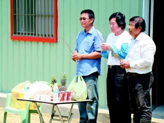 戴振耀陪邱义仁焚香拜拜,祈求风调雨顺年年收成好;他说,前晚两人聊种田的事聊到12点多,邱义仁对务农很有兴趣。