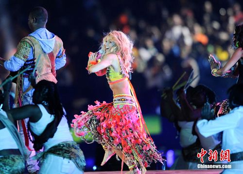 随后有“拉丁天后”之称的哥伦比亚女歌星夏奇拉与南非本土组合Freshlyground出场,一同演唱本届世界杯的官方主题曲《Waka Waka (This Time For Africa)》。夏奇拉扮相性感,歌曲舞蹈动作热情奔放,显示出浓厚的非洲风格。