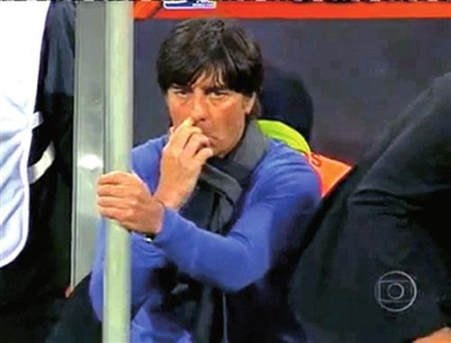 德国队主教练勒夫是很多女球迷眼中的帅哥,衣着考究,举手投足都透着优雅的范儿,就连他穿的那件经典的羊绒衫,据说在德国都已经卖到全国脱销。然而,在德国队与英格兰队的比赛中,坐在教练席上的勒夫“品尝”自己鼻屎的尴尬一幕却被镜头逮个正着。