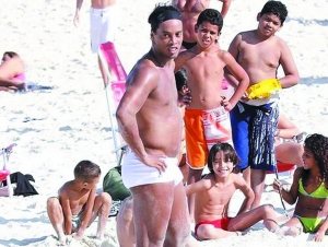 因为此前AC米兰一直对他能否留队举棋不定,世界杯又被邓加抛弃,小罗只好自己去寻开心,他先是相约帕托等人在奢华酒店享受,随后又到里约热内卢沙滩玩耍。只是他忘了给自己的大肚腩遮羞,臃肿的身材似乎正在向大罗看齐。