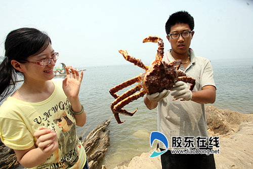 远渡重洋来到烟台的这几只大螃蟹,不但体格超大,而且还有一些特异功能呢。其中有只螃蟹6斤重,展开之后一米长,售价接近2000元。矫先生所开的大排档员工小魏特地让这只螃蟹给记者演示了一下“霸王”的预测本领。