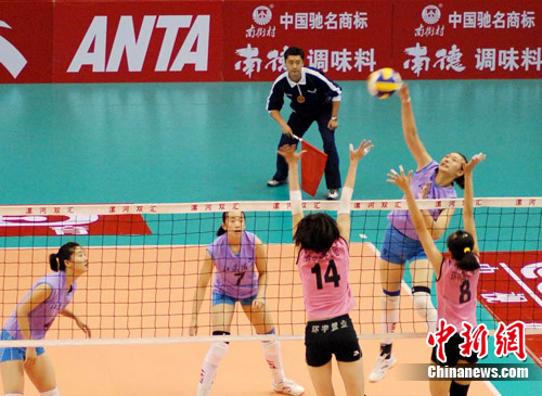 中新网漯河8月1日电 (记者 师红垒 通讯员 林波)7月31日上午,2010年全国女排锦标赛(双汇赛区)在漯河市体育中心体育馆进行了交叉赛的4场较量,东道主河南队0:3不敌缺席多名国手的全国女排联赛七冠王天津队,江苏3:0战胜辽宁,山东3:1击败云南,广东0:3负于河北。四场比赛的具体比分是:天津-河南(25:16、25:16、25:11);江苏-辽宁(25:21、27:25、25:18);山东-云南(25:21、20:25、25:19、25:21);广东-河北(8:25、23:25、12:25)。