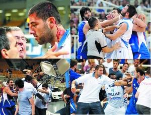 昨天的比赛临近结束时,希腊队当时以74比73领先塞尔维亚,随后双方两名无球队员产生口角,并发展成肢体冲突。而后发生了最残酷的一幕,塞尔维亚队队长、效力于NBA雷霆队的科斯蒂奇卷入冲突,他抓起一把椅子丢向比赛中与其对位的希腊队中锋肖特萨尼蒂斯,不料椅子却击中因伤坐在希腊队替补席上的布鲁西斯,后者头部顿时鲜血直流。此后有多名球员卷入此次群殴事件,现场乱作一团。据美联社报道,双方后在球员通道内再次发生斗殴。而就在这起恶性打架事件发生前6分钟左右,塞尔维亚队主帅伊夫科维奇因与主裁判发生冲突而被吹了两次技术犯规,最终被逐出场。