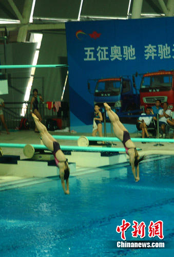 在今天上午首先进行的女子双人3米跳板比赛中,共有来自各省的25对选手参加。其中获得冠军的上海队陈雯/贺婉莹在比赛中表现突出,在第一轮排名12的他们,在第二轮比赛中凭借成熟动作一下升至排名第2的位置。在后面的3轮比赛中,此两位选手的比分一直高居不下,占据着前3的位置。