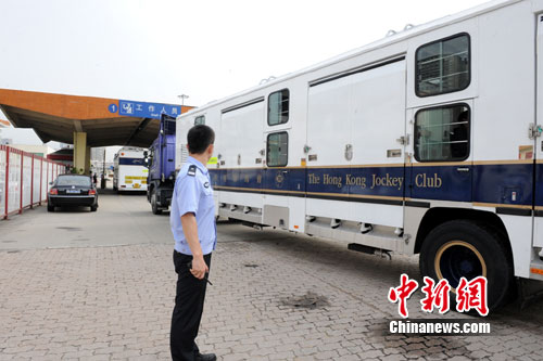 10日清早7时40分,香港赛马会的两辆粤港两地牌货车(车内运有18匹赛马)和6辆随行保障车由香港经皇岗口岸入境,皇岗边检站警戒队按预案要求,派警车从桥头将运马车辆一行安全引带至货检入境查验场地停靠在指定的临时候检区域,并担负警戒监护工作。在检验检疫部门进行消毒的同时,货车检查队、小(客)车检查队的民警立即联动,高效、快捷、优质的为入境机动车司机、马童及随行人员共33人的证件办理查验手续。8时50分,运马车辆及随行人员离开皇岗口岸前往广州亚运马术场。