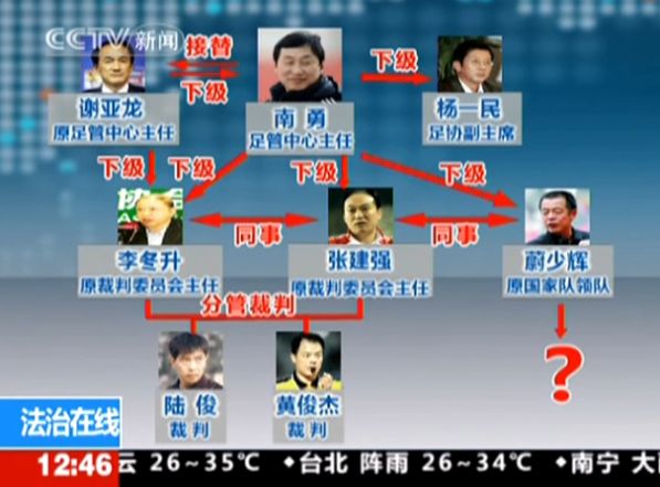 中新网9月13日电 自上周末公安部证实前谢亚龙、李冬升和蔚少辉已被立案侦查之后,中国足协已有多人被抓。中央电视台在今天的新闻节目中,解析了“足协高官涉案”的“关系网”。