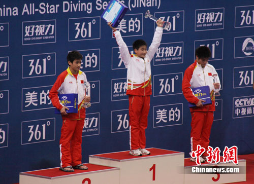 中新社济南9月18日电 (张译文)2010—2011中国跳水明星系列赛第二站的比赛18日晚继续在济南举行。在刚刚结束的男子10米跳台决赛中,北京选手曹缘凭借完美发挥获得105.45高分夺得冠军,亚军、季军分别被来自广东的张雁全和上海的火亮获得。