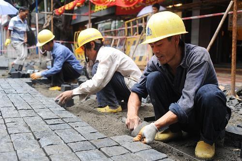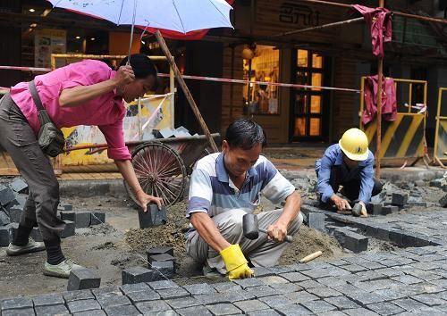 作为迎亚运市容改造工程的一部分,工人们需要为280多米长的惠福路铺上灰麻石。此项工程必须在9月30日完工,中秋佳节,工人们依旧没有停下手上的工作,为亚运工程加班加点。