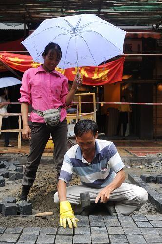 来自广西的黄秀树(左)为正在铺路的丈夫廖孙国一边撑伞一边递砖