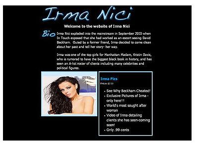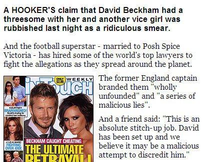 北京时间9月23日,据英国小报《太阳报》报道,26岁的妓女艾玛-尼西近日对媒体宣称,2007年8月,在纽约的Le Parker Meridien酒店,贝克汉姆支付了3200英镑和她上床,尼西还称,另一名女孩后来也加入了,小贝另支付了1500英镑,先是观看两名女孩的亲热表演,然后自己加入了3P游戏。