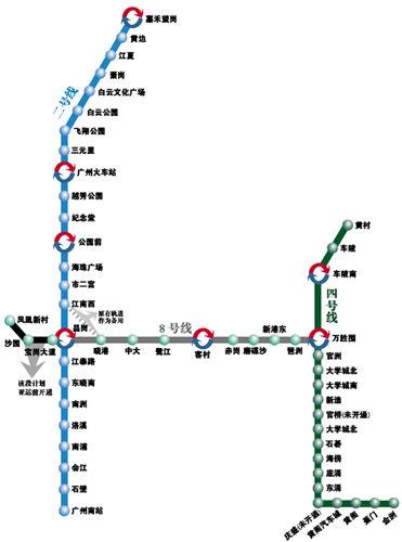 八号线(万胜围至凤凰新村)全长14.97公里,设有13座车站。从西至东依次是凤凰新村站、沙园站、宝岗大道站、昌岗站、晓港站、中大站、鹭江站、客村站、赤岗站、磨碟沙站、新港东站、琶洲站、万胜围站。八号线昌岗站至凤凰新村站暂不开通,计划于亚运会召开前开通。