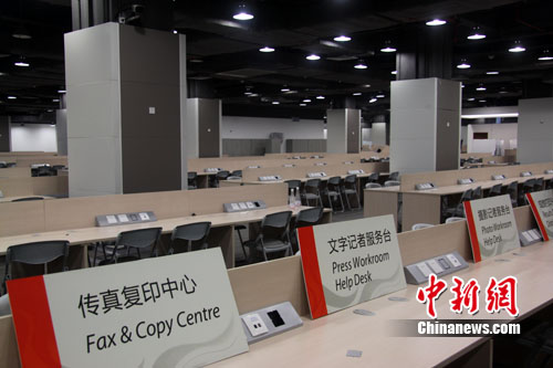 在媒体工作间里,网线端口和电源插座一应俱全,文字记者和摄影记者的工作间也有所区分,宽敞的空间可以满足各国媒体的工作需要。