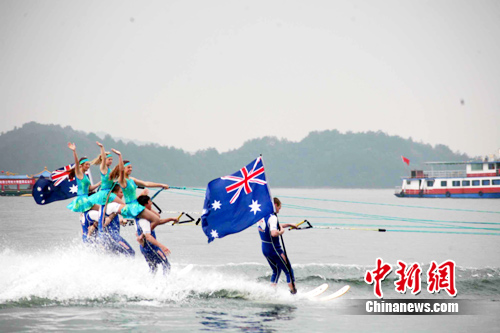 28日,中澳滑水运动精英首次联合在庐山西海风景区向观众们展示精彩的水上芭蕾、赤脚滑水、特技跳跃、尾波空翻、双人、多人技巧、多人金字塔等精彩的滑水表演,让现场观众一饱眼福。