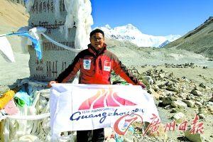 从广州到温哥华再到珠穆朗玛峰,8个月的时间,上万公里的路程,这幅肩负着广州亚运会宣传任务的旗帜终于飘扬在了珠峰。