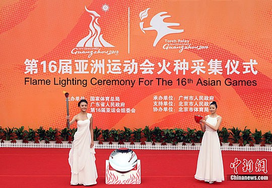 从全国女大学生中遴选出的第16届亚运会火种采集使者、22岁的昆明姑娘康辰晨高举采火棒款款行至烽火台正中央放置的采火盆前,将火种棒置于收集太阳光的凹面镜聚焦处,经过两分多钟的等待,一缕火苗突然绽放,采火棒被成功引燃。康辰晨将采火棒交给广州亚组委执行主席、广东省省长黄华华,后者点燃采火少女手中的火种盒。随后,两名火种护卫将上场,从火种盒中引火点燃火种灯,广州亚运会火种采集成功!与奥林匹克精神一脉相承,寓意人类和平、友谊、进步的亚运火种,在象征着中华民族脊梁的北京古长城上闪耀。