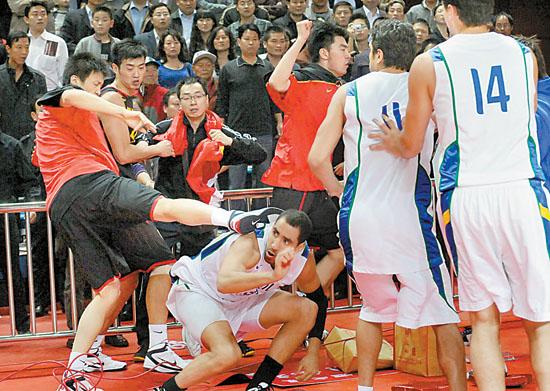 10月12日,中国球员(红衣)与巴西球员大打出手。新华社记者 王颂摄