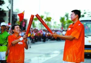 男篮老队长王治郅(右)在交接火炬。昨日,广州亚运会火炬传递活动在惠州举行。 新华社记者 刘大伟 摄