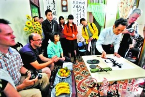下午2时整,罗泽权下楼迎接德国游客。一名德国游客连连称赞说,“能够把古建筑保留下来,对于这个地区非常有意义,都府社区古色古香,反映了广州的历史文化,非常棒!”过了一会儿,罗泽权老人拿出笔墨纸砚,挥毫写下了一个大大的“福”字,并将这幅书法送给了其中一名德国游客。临别时,23名德国游客依依不舍地与罗泽权老人一一握手道别,并祝他老人家“健康长寿,越活越年轻”!