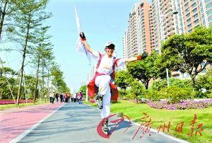读者李松辉昨日带来独特的行头单排滑轮和亚运旗帜,走在人群中向市民宣传亚运