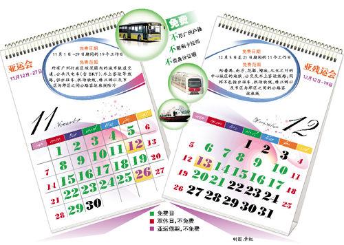 根据相关规定,在亚运会及亚残运会机动车单双号限行的46天里(11月1日至29日、12月5日至21日),剔除13个双休日和3天新增假期后的30个工作日里,市民都可免费享受公共交通服务。有关部门预计,免费期间广州每天将新增300万人次的客流,高峰期可能出现“井喷”,请没有刚性出行需求的市民注意错峰出行。