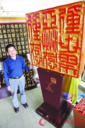 广州日报11月4日报道(文/图记者李立志)在广州番禺有一位奇人郭劲帆,花了两年时间精心制作的篆雕作品——高2.1米,宽1.3米的“亚运巨印”。亚运前夕,他想将这个可能是世界上最大的印章献给亚运会。