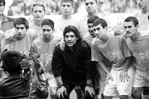 按照此次温暖中国行的计划,马拉多纳带领的阿根廷队将与李明领衔的山东国脚进行一场义赛,所得款项捐献给中国红十字基金会,届时老马将会亲自登场比赛。下午14时30分左右,奥体中心体育场已经坐了一大半球迷,有人穿着阿根廷国家队的蓝白球衣,有人举着纪念围巾。球场上两支队伍在热身,并不见主角马拉多纳的影子,工作人员称他还在飞机上。