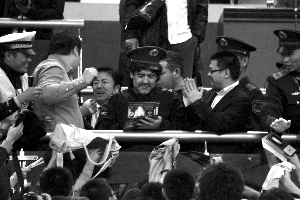 签名、绕场一周、颠球、演讲……马拉多纳用尽了招数也没能取悦昨日来济南奥体中心观看比赛的球迷,因为他们都是冲着“老马保证登场不少于20分钟”这个噱头而来,但是球王并未如约展示球技。