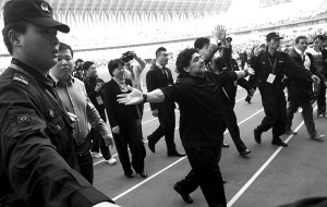 终场前5分钟,主席台上的马拉多纳终于起身,现场主持人兴奋得马上宣布,“马拉多纳因为有腿伤,特地半小时前打了封闭,现在可以下场踢球了。”一时间,全场又是一阵欢呼声。不过,此时全场最搞笑的一幕出现了,脚穿皮鞋的马拉多纳在赞助商陪同下走到场边,然后,对着场内大呼小叫了一番,前后不过三四分钟时间,主裁就吹响全场结束哨声。看台上,至少花200元钱买票入场的球迷这才发觉上当,终于爆发出阵阵吼声:“骗子,退票!退票!”此时,老马头也不抬,一溜烟跑回了休息室。记者 徐东海