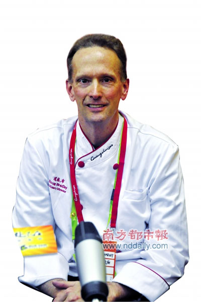 这名身高1 .95米的美国“总厨”,自2008年北京奥运会后便定居中国,去年12月份还把家安在了广州,喜欢吃烧鹅,也习惯在饭后喝上一碗双皮奶当甜品。“但是 ,中国菜能进亚运菜单绝不是我一个人说了算”。