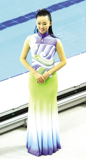 蓝绿和黄绿交织,间或一抹白色,亚运颁奖小姐的礼服,有一个好听的名字,叫做“行云流水”。穿在身上,能勾勒出礼仪小姐玲珑婀娜的身段,展现别有一番韵味的东方美。