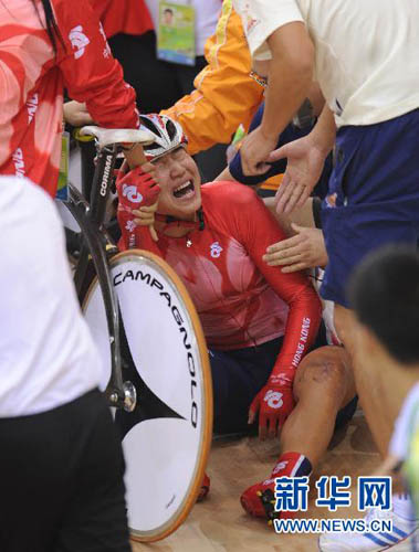 11月16日,中国香港选手刁小娟在比赛中摔倒受伤,表情十分痛苦。随后她因伤退出比赛。当日,第16届亚运会场地自行车女子计分赛发生了严重的车辆相撞导致车手摔倒的事故,几名选手因伤退出比赛。新华社记者李尕摄